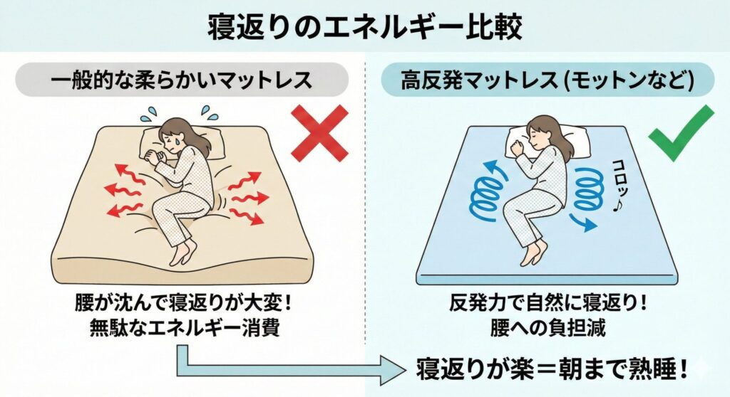 このように、反発力が寝返りをサポートしてくれるので、勝手に体が転がる感覚です。 睡眠中に腰の筋肉を使わなくて済むから、朝起きた時の「腰の軽さ」が全然違います。