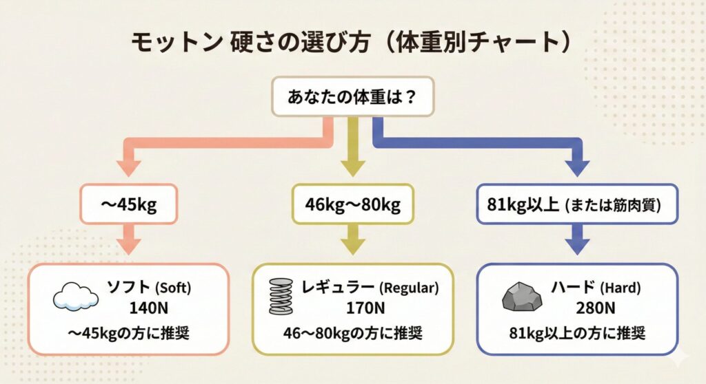 モットンは、体重に合わせて3種類の硬さから選べます。